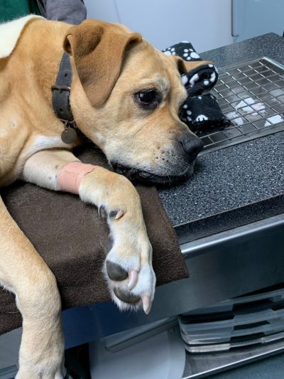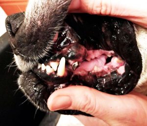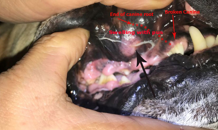 The next day, Bella still looking pretty bad, I went to get a 2nd opinion at another vet. After a very brief look at the dog, the vet concluded that this must be an allergic reaction and gave her a Steroid injection….. When I mentioned the broken canine I was offered a “dental appointment” 2 weeks later to remove both canines.