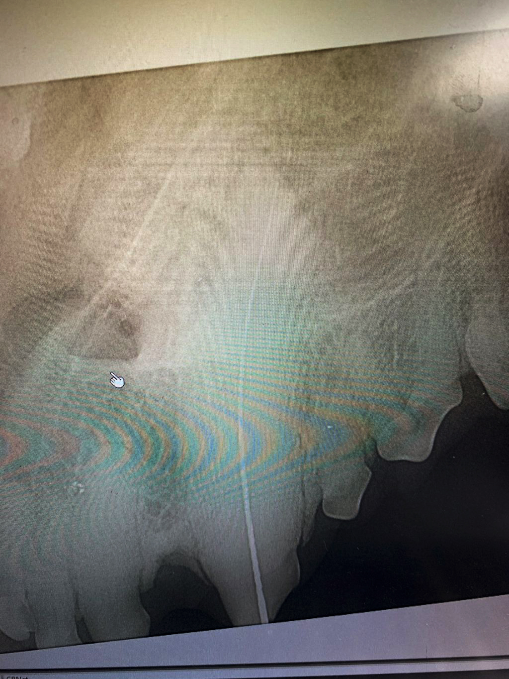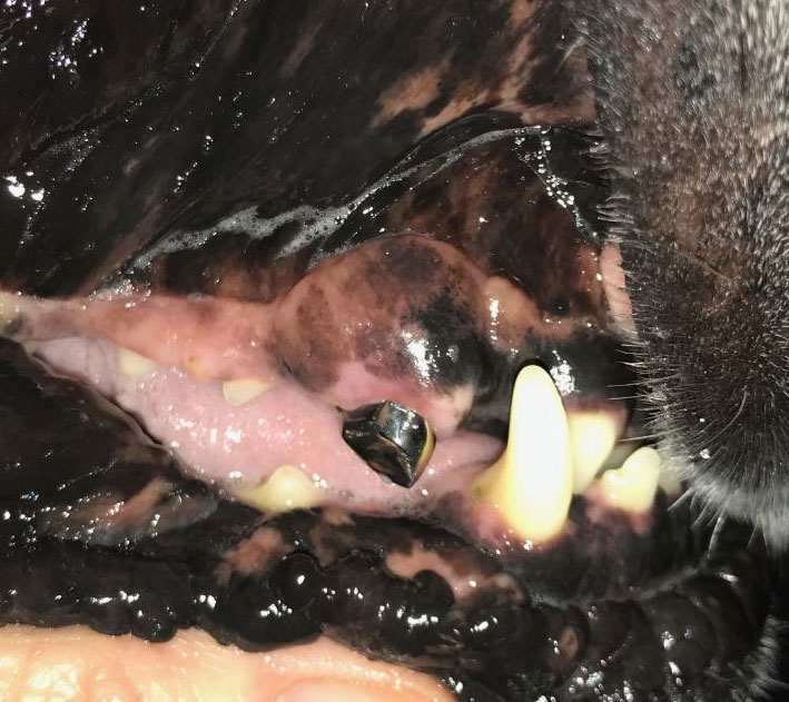 Crown/Root cap fitted on the right canine. The technician made it too short but it’s still effective to protect the tooth.