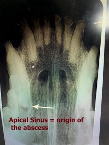 November 2019: Bella came back from a walk with a very swollen right side of her face and muzzle. My initial suspicion was that her fractured canine had become infected and caused an abscess. This was confirmed when I palpated the gum in the canine/premolar area. The swelling felt firm (like an abscess does) and was clearly causing pain.  It was very clear that this must be an abscess.  What to do …?